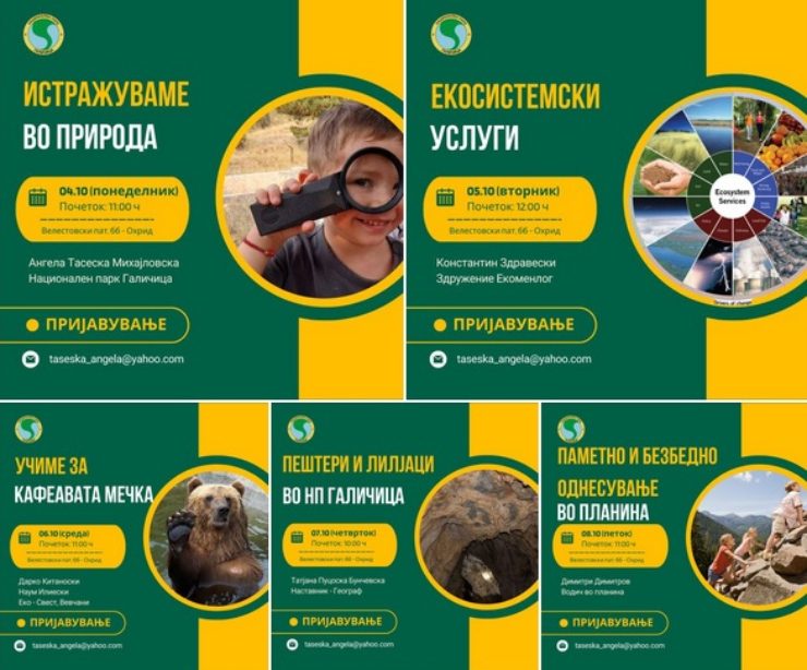 Првиот ден работилницата е посветена на истражување на природата, а ќе ја предводи Ангела Тасеска Михајловска. На 5-ти ноември присутните заедно со Константин Здравески ќе научат што се тоа екосистемски услуги и како ги вреднуваме истите, следно Дарко Китаноски и Наум Илиески од Еко-Свест од Вевчани ќе објаснат нешто повеќе за кафеавата мечка, а за пештерите и лилјаците во НП „Галичица” ќе зборува Татјана Пуцоска Бунчевска. Едукативната недела ќе биде заокружена со работилницата „Паметно и безбедно однесување во планина” што ќе ја одржи Димитри Димитров, долгогодишен искусен планинар.