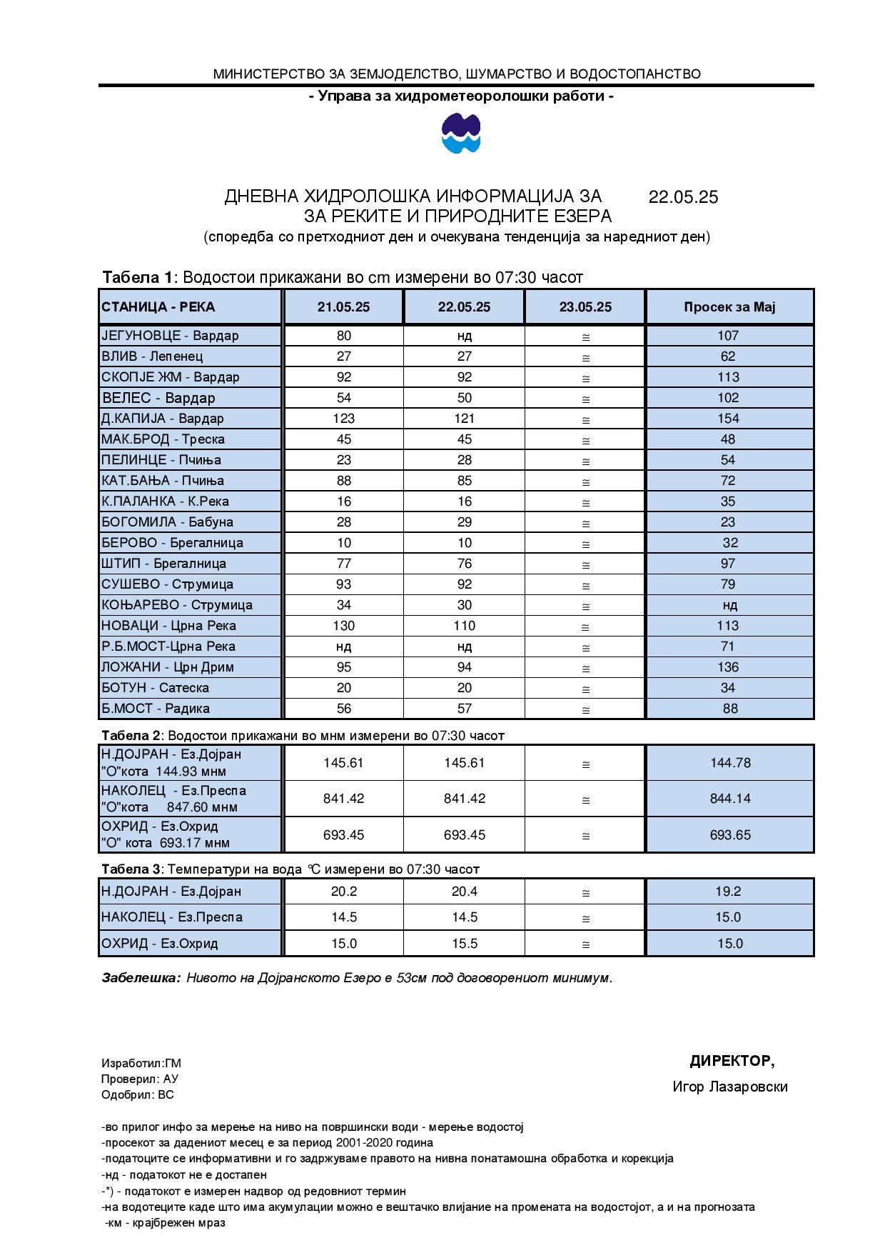 Според денешните мерења на Управата за хидрометеоролошки работи на Република Македонија (УХМР) водат е на кота од 693,45 м.н.в што е за 20 сантиметри под просекот за овој месец (693,65 м.н.в) и 35 сантиметар над минимално дозволената кота (693,10 м.н.в). Температурата на езерската вода, измерена утрово е 15,5 степени, за половина степен повисока од просечната.