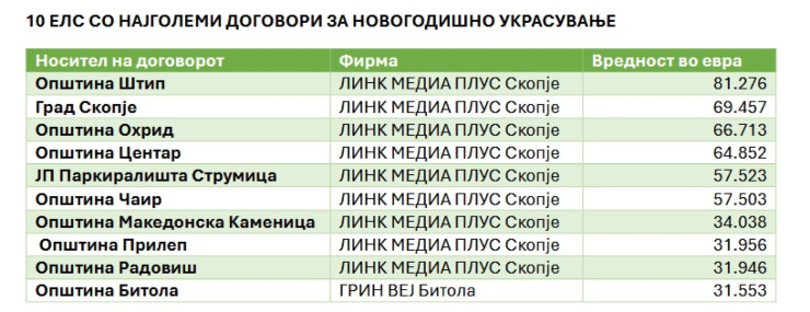 Најмногу пари за новогодишно украсување потрошила Општина Штип склучувајќи договор со фирмата Линк Медиа Плус од Скопје во вредност од 4.998.480 денари, односно 81.276 евра. Градот Скопје е на второ место со договор склучен со истата фирма во вредност од 4.271.600 денари, односно 69.457 евра.